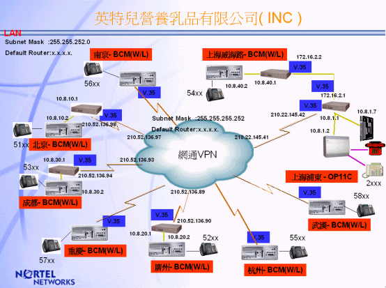 此系統(tǒng)的VPN線路由中國網通公司提供,INC上海浦東生產基地為主點(Nortel OP11C)系統(tǒng)通過ITG(Internet Telephone