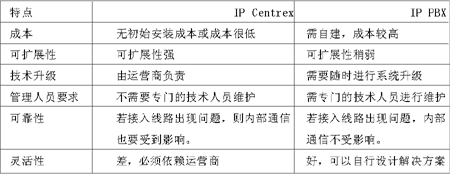 運(yùn)營(yíng)商自然不會(huì)聽之任之,因此推出了IP Centrex業(yè)務(wù)與其相抗衡。由附表可以很明顯地看出,與IP PBX相比,IP Centrex的優(yōu)勢(shì)有:初期投入成本小、以辦公費(fèi)用方式容易控制現(xiàn)金流;無(wú)須對(duì)網(wǎng)絡(luò)、業(yè)務(wù)平臺(tái)進(jìn)行維護(hù);平臺(tái)規(guī)模與公司規(guī)模同步增長(zhǎng);具有對(duì)公網(wǎng)的開放性;辦公地點(diǎn)的任意性、易擴(kuò)展;使企業(yè)集中在主營(yíng)業(yè)務(wù)領(lǐng)域;業(yè)務(wù)可擴(kuò)展性好。