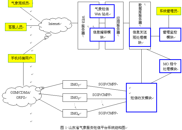 山東省氣象臺為實現“1210手機氣象站”服務,通過技術合作的方式建設了山東省氣象服務短信平臺。該平臺采用操作系統(tǒng)無關、開放性好的J2EE軟件架構,數據庫選用處理能力強、穩(wěn)定性好的Oracle9i大型數據庫系統(tǒng),該平臺目前正在為全省50萬用戶每天通過短消息提供各種天氣預報服務。下面將主要介紹氣象短信平臺的系統(tǒng)結構、各模塊功能和系統(tǒng)特點。