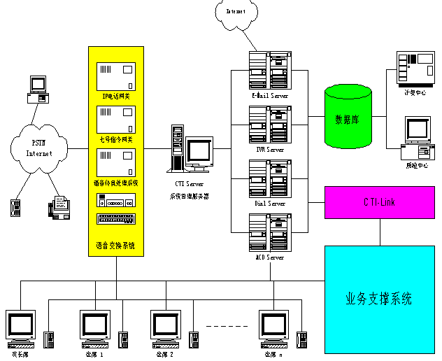 所述的電子郵件服務器(7)、交互式語音管理服務器(8)、撥號服務器(9)以及用于平均分配話務的語音系統(tǒng)分配服務器(10)均位于所述系統(tǒng)管理服務器(6)與數據庫(12)之間。所述的四個服務器(7~10)通過一個CTI業(yè)務接口(15)與業(yè)務支撐系統(tǒng)(16)連接。