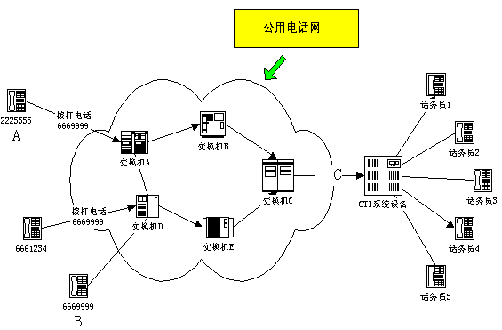 使用該方法,用戶根據需要將電話轉移到CTI系統(tǒng),完全解決了傳統(tǒng)CTI系統(tǒng)采用專用特服號碼服務所帶來的弊端,其充分利用了傳統(tǒng)電話交換機原有的功能,實現了使用用戶的普通電話號碼完全站在用戶立場的24小時分布式客戶服務,能夠為用戶提供語音、傳真、數據及人工服務等接續(xù)服務。