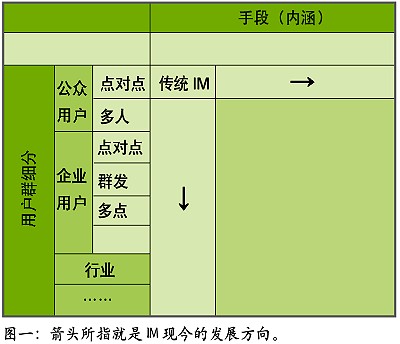 IT行業(yè)發(fā)展數(shù)十年,有一個(gè)共識(shí),或是一種經(jīng)驗(yàn)結(jié)論,大約是:在用“老工具解決新問(wèn)題”、“老工具解決老問(wèn)題”、“新工具解決老問(wèn)題”、“新工具解決新問(wèn)題”四者中,一般最先者最善,也極討巧,最后者則最為事倍功半。觀IM發(fā)展趨勢(shì),似乎介于“新工具解決老問(wèn)題”、“新工具解決新問(wèn)題”二者之間,就體現(xiàn)在表中兩個(gè)箭頭上,是以錢(qián)景堪憂(yōu)。