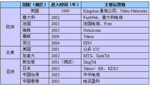 表1 部分國(guó)家和地區(qū)進(jìn)入IPTV市場(chǎng)的年份及主要運(yùn)營(yíng)商
