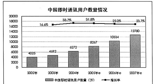 圖為:02年-07年中國即時通訊用戶數(shù)量及增長率 來源:艾瑞咨詢