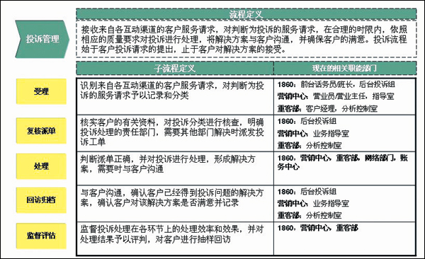 - 流程方面。投訴處理的后臺(tái)分屬不同的部門,流程不統(tǒng)一,管理和考核指標(biāo)也不統(tǒng)一; 投訴等級(jí)的標(biāo)準(zhǔn)不明確,各渠道不統(tǒng)一; 缺乏投訴升級(jí)流程,缺乏對(duì)各流程、各處理環(huán)節(jié)的時(shí)限定義。
