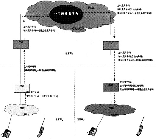 在圖1中,運營商2的用戶撥叫運營商1的一號通業(yè)務用戶號碼時,呼叫將通過運營商2的網關(GW2)、運營商1的網關(GW1)接續(xù)到運營商1的一號通業(yè)務平臺中。一號通業(yè)務平臺根據(jù)一號通業(yè)務用戶設置的接續(xù)規(guī)則,將呼叫翻譯到指定的目的地號碼。目的地號碼可能是運營商1的用戶,也可能是其他運營商的用戶。