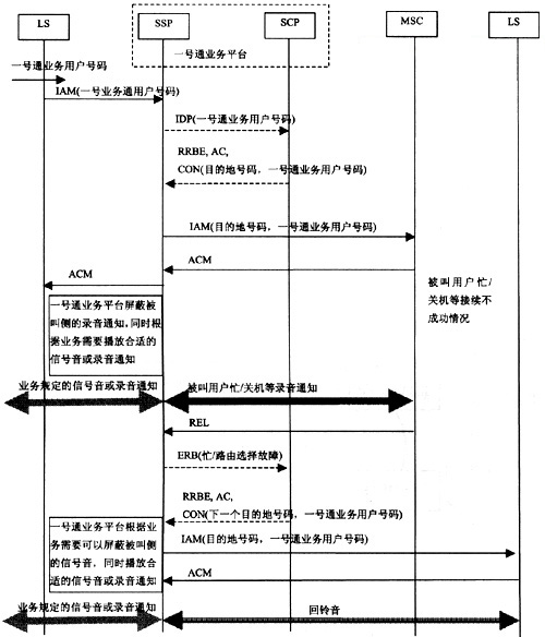 基于目前現(xiàn)網的信令處理方式,當一號通業(yè)務用戶所設定的目的地號碼為移動用戶時,如果出現(xiàn)被叫用戶忙、關機等接續(xù)不成功情況,現(xiàn)有的移動交換機會給主叫用戶播放錄音通知,通知用戶,如果主叫用戶不掛機,則在通知播放完畢后向前端交換機后向返回REL消息,釋放呼叫。一號通業(yè)務平臺收到釋放消息后根據(jù)業(yè)務需要,進行下次接續(xù)。如果按照原有的信令流程,主叫用戶會先聽到被叫用戶忙或關機的錄音通知,然后又聽到下一個呼叫的回鈴音。為了避免出現(xiàn)這種現(xiàn)象,一號通業(yè)務平臺要能夠屏蔽被叫側播放的錄音通知和信號音,并根據(jù)業(yè)務需要向主叫用戶播放合適的信號音或錄音通知,具體的屏蔽方式由一號通平臺自行確定。以智能網實現(xiàn)、ISUP消息為例,具體的消息流程如圖3所示。