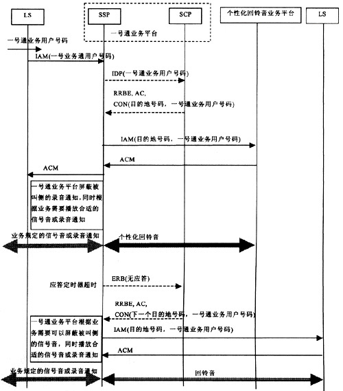 按照圖3所示的信令方式,一號通業(yè)務平臺屏蔽被叫側錄音通知后,如果被叫用戶申請了個性化回鈴音業(yè)務,則會產生一號通業(yè)務與個性化回鈴音業(yè)務之間的互斥性,即如果一號通業(yè)務用戶所設定的目的地號碼申請了個性化回鈴音業(yè)務,個性化回鈴音業(yè)務平臺給主叫用戶播放的錄音通知會被一號通業(yè)務平臺所屏蔽,主叫用戶將聽到由一號通業(yè)務平臺統(tǒng)一播放的信號音或錄音通知,而聽不到個性化回鈴音。以智能網實現(xiàn)、ISUP消息為例,具體的消息流程如圖4所示。