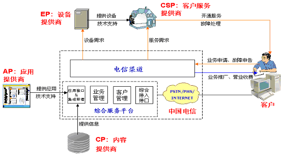 中國電信:綜合信息服務(wù)提供商,提供品牌、平臺、接入和渠道,負(fù)責(zé)業(yè)務(wù)的組織、運(yùn)營、銷售和管理,并為客戶提供統(tǒng)一的服務(wù)界面。