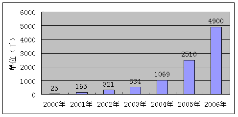 全球目前大約有700萬戶用戶使用移動PushE-mail業(yè)務(wù),其中大部分都屬于企業(yè)用戶。RIM(全稱為ResearchInMotion)公司的黑莓(Blackberry)是全球最成功的Push E-mail業(yè)務(wù),全球用戶已經(jīng)接近490萬戶,其中絕大多數(shù)用戶集中在北美,超過400萬戶,F(xiàn)在全球已經(jīng)有150家移動運營商采用RIM公司的黑莓業(yè)務(wù)為用戶提供Push E-mail業(yè)務(wù),不過一些市場新進入者正在崛起,如Seven、Visto、Nokia、微軟等公司,這些公司也看好這個市場,正在大舉進入。Intellisync公司預(yù)測到2008年全球用戶將超過4000萬戶。圖1為RIM公司2000-2006年Blackberry用戶數(shù)。