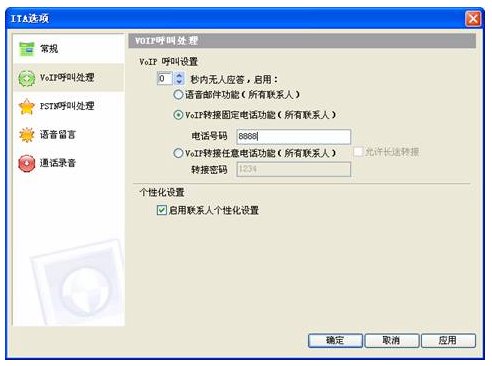 啟動 VoIP呼叫轉(zhuǎn)接固定電話功能,設(shè)置0秒啟動,轉(zhuǎn)接固定電話號碼為交換機內(nèi)置語音引導號8888,如圖,假設(shè)8888是交換機上配置的語音引導號。