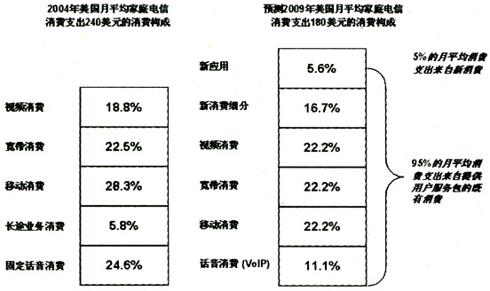作為可以提供整合平臺(tái)的服務(wù),IMS在消費(fèi)者和企業(yè)應(yīng)用上都會(huì)為運(yùn)營(yíng)商帶來收入的增長(zhǎng)。首先分析IMS可能為消費(fèi)者帶來的收入增長(zhǎng)。比較美國(guó)2004年和2009年預(yù)計(jì)的電信消費(fèi)支出構(gòu)成。2009年,95%的消費(fèi)支出仍然是既有的業(yè)務(wù),運(yùn)營(yíng)商通過提供業(yè)務(wù)包和服務(wù)包捆綁既有用戶群。5%的新消費(fèi)支出是IMS新應(yīng)用的主戰(zhàn)場(chǎng)。