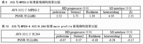 對視頻編碼標(biāo)準(zhǔn)進(jìn)行客觀評價(jià)的常用方法是峰值信噪比PSNR。表9、表10分別給出了AVS與MPEG-2標(biāo)準(zhǔn)以及AVS與MPEG-4 AVC/H.264標(biāo)準(zhǔn)main