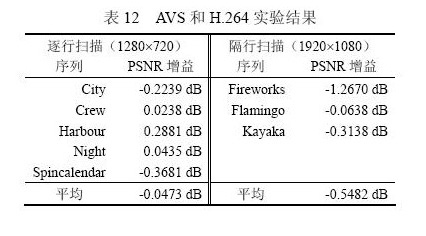 profile的客觀編碼性能。結(jié)果為相同碼率條件下峰值信噪比PSNR的增益。可以看出,AVS相對于MPEG-2標(biāo)準(zhǔn)編碼效率平均提高2.56dB,相比于H.264標(biāo)準(zhǔn)編碼效率略低,平均有0.11dB的損失。
