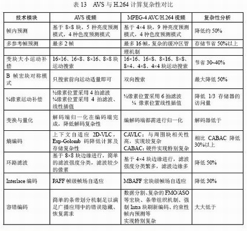 表13對AVS與H.264的計(jì)算實(shí)現(xiàn)復(fù)雜性進(jìn)行扼要對比,大致估算,AVS解碼復(fù)雜度相當(dāng)于H.264的30%,AVS編碼復(fù)雜度相當(dāng)于H.264的70%。