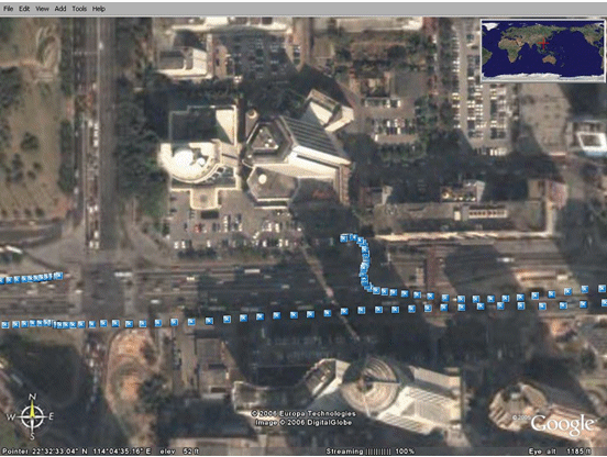 下圖顯示的是在中國深圳市進行汽車試駕時的GPS數(shù)據(jù),利用的是Google earth應(yīng)用程序。圖中的每一個藍點代表一個GPS讀數(shù)。這些點在每隔一秒的時間內(nèi)讀出,因此,連續(xù)點之間的距離就代表著汽車的速度。我們甚至可以看見汽車駛?cè)氪髽堑耐\噲觥?br />