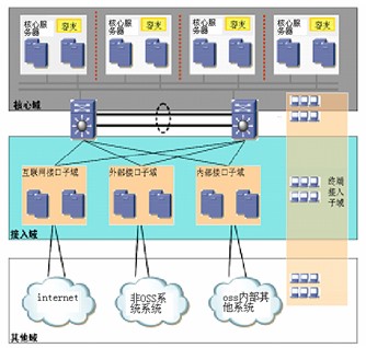 OSS管理者在保證及時(shí)準(zhǔn)確的提供信息服務(wù)的基礎(chǔ)上,應(yīng)該按不同的安全級(jí)別研究對(duì)安全域進(jìn)行劃分,確認(rèn)那些為核心子域,那些為接入域,那些為其他域。通過(guò)對(duì)不同的安全域進(jìn)行不同的安全策略劃分,保證如上的安全域所享受的安全級(jí)別是不同的。圖1顯示,核心域、接入域和其他域是第次接入的,向下訪(fǎng)問(wèn)可以透明傳輸,而向上的訪(fǎng)問(wèn)就必須設(shè)定相應(yīng)的訪(fǎng)問(wèn)控制。