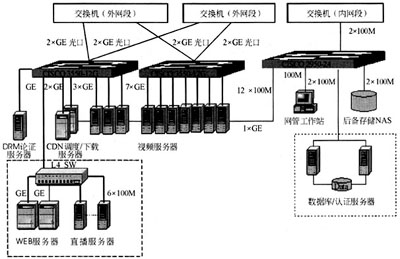 核心包括以下子系統(tǒng):WEB服務(wù)子系統(tǒng)、認(rèn)證服務(wù)器、CDN調(diào)度/下載服務(wù)器、流媒體播出服務(wù)子系統(tǒng)、DRM認(rèn)證服務(wù)子系統(tǒng)、數(shù)據(jù)庫(kù)服務(wù)子系統(tǒng)、后備存儲(chǔ)NAS系統(tǒng)、內(nèi)部管理服務(wù)子系統(tǒng)等。