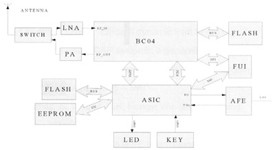 其中,BC04支持最大4個活動連接(包括耳機(jī)),同時支持兩路SCO語音,所以語音通過PCM和ASIC PCM相接可以有多路被送到模擬端,從而實現(xiàn)3方通話。ASIC部分實現(xiàn)PCM語音數(shù)據(jù)與模擬語音信號的相互轉(zhuǎn)換,通過發(fā)送和接收PSTN信令,負(fù)責(zé)對人機(jī)界面的控制。它通過GPIO(General