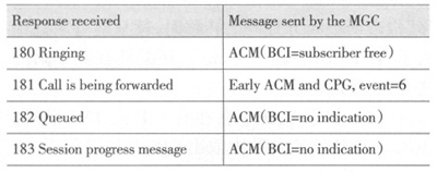 MGC收到的響應(yīng)消息中,如果是100 trying消息則網(wǎng)關(guān)不觸發(fā)任何PSTN消息。如果是18x消息,且消息體中沒有ISUP消息,此時(shí)網(wǎng)關(guān)需要判斷在此之前是否有ACM發(fā)送出去。如果之前沒有ACM發(fā)送出去,MGC將依據(jù)表1來響應(yīng)消息。