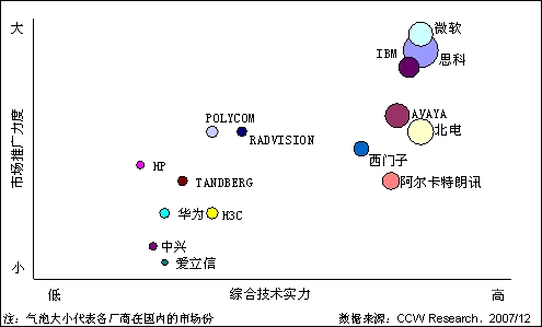 市場競爭非常激烈,但還沒有一個廠商占據(jù)對優(yōu)勢。目前統(tǒng)一通信市場形成了兩類供應商的競爭:電信網(wǎng)絡設備廠商(如思科、北電)和軟件廠商(如微軟、IBM)。電信設備廠商的優(yōu)勢集中在硬件產(chǎn)品上,比如路由器、VoIP網(wǎng)關(guān)產(chǎn)品、軟交換設備;而軟件廠商,像微軟、IBM的優(yōu)勢在于其在電腦桌面上的絕對統(tǒng)治力,幾乎所有的統(tǒng)一通信企業(yè)都需要和微軟、IBM進行合作。但從現(xiàn)在的發(fā)展狀況來看,各類廠商之間既有競爭又有合作,但還沒有一個廠商占據(jù)對優(yōu)勢。