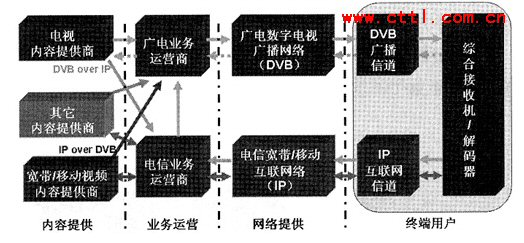 從圖2中我們可以看出,IPTV實際上有電信和廣電兩條業(yè)務(wù)通道。其中,電信的業(yè)務(wù)通道是雙向的通道,而廣電的業(yè)務(wù)通道是單向的,電視內(nèi)容提供商可以利用DVBoverIP技術(shù)通過電信業(yè)務(wù)運營商來開展IPTV業(yè)務(wù)。寬帶/移動視頻內(nèi)容提供商也可以利用IPover DVB技術(shù)通過廣電業(yè)務(wù)運營商來開展IPTV業(yè)務(wù)。由于廣電的業(yè)務(wù)通道是單向的,需要找到一條回路才能開展IPTV業(yè)務(wù)。這條回路既可以借助電信的業(yè)務(wù)通道來實現(xiàn),也可以再重新鋪設(shè)一條回路(盡管再重新鋪設(shè)一條回路會由于從技術(shù)和經(jīng)費上都需要巨大投入而使雙向改造實現(xiàn)起來十分困難,并且這種改造的投入和產(chǎn)出之間可能會產(chǎn)生相當大的差距,雖然可行性不大,但這畢竟是一種可以實現(xiàn)的解決方案)。