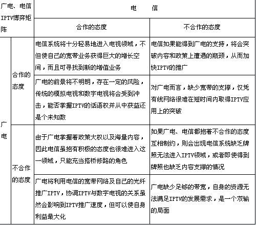 電信、廣電雖然都想爭奪IPTV的主導地位,但通過博弈矩陣可以看出,電信和廣電的互相滲透將是打造成熟的IPTV產業(yè)鏈的必然。廣電運營商具有內容優(yōu)勢,電信運營商擁有交互技術和網絡。廣電網絡的條塊分割決定了廣電運營商豐富的內容資源一旦脫離了電信的IP網絡,就很難抓住IPTV的機會;而電信運營商的網絡資源沒有內容,也會遭遇發(fā)展瓶頸,惟有廣電和電信合作競爭才是IPTV產業(yè)走向健康發(fā)展的現實選擇。