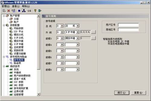 IP PBX 進行配置(如圖)。人機界面簡潔易懂,即便是不懂通訊的外行人,在看過說明書后也能輕松自如地使用。配置起來簡單,例如選擇外線撥號前綴號、做呼叫中心時的ACD輪循分機線路輪循、回?fù)艿,僅僅選下數(shù)字點下提交,幾秒內(nèi)就可配置結(jié)束。