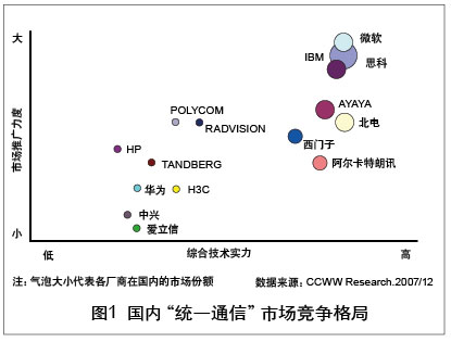 “統(tǒng)一通信”與傳統(tǒng)通信的根本區(qū)別在于不僅僅是網(wǎng)絡(luò)的融合,也是應(yīng)用的融合。從這個(gè)層面來(lái)看,“統(tǒng)一通信”真正帶給用戶的是成本的降低、工作效率的提升以及整個(gè)運(yùn)行機(jī)制的改變!敖y(tǒng)一通信”是以人性化為特征應(yīng)用層面的融合,這種融合囊括了更多的內(nèi)容、覆蓋更廣闊的領(lǐng)域、具有更大的力量,它使得通信產(chǎn)業(yè)與IT產(chǎn)業(yè),通信設(shè)備商、軟件廠商與電信運(yùn)營(yíng)商之間的邊界越來(lái)越模糊,跨行業(yè)、跨領(lǐng)域的聯(lián)盟與合作成為開拓市場(chǎng)的必需。但隨著眾廠商的紛紛加入,多款“統(tǒng)一通信”產(chǎn)品及解決方案的推出,“統(tǒng)一通信”市場(chǎng)展現(xiàn)出了勃勃生機(jī)和巨大的成長(zhǎng)潛力。在這些廠商中,有市場(chǎng)調(diào)研數(shù)據(jù)顯示思科市場(chǎng)份額領(lǐng)先,市場(chǎng)占有率高達(dá)35%。各類廠商之間既有競(jìng)爭(zhēng)又有合作,但還沒(méi)有一個(gè)廠商占絕對(duì)優(yōu)勢(shì)。實(shí)際上,“統(tǒng)一通信”市場(chǎng)上的競(jìng)爭(zhēng)者并不僅僅是這幾家巨頭,眾多網(wǎng)絡(luò)工具廠商、商用電話廠商也參與了這一競(jìng)爭(zhēng)平臺(tái)。幾乎所有和ICT有關(guān)的巨頭廠商都集中在了這個(gè)領(lǐng)域,“統(tǒng)一通信”正進(jìn)入群雄爭(zhēng)霸的時(shí)代。國(guó)內(nèi)“統(tǒng)一通信”市場(chǎng)競(jìng)爭(zhēng)格局如圖1所示。