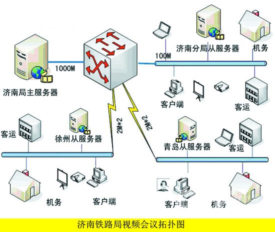 由于路局改革后組織結(jié)構(gòu)的特點,決定了跨地域會議較多,如濟南和徐州、青島之間召開的部門級別的會議比較頻繁,加上三地之間的帶寬制約,本方案采用了主從服務(wù)器的系統(tǒng)架構(gòu),1主3從,主服務(wù)器設(shè)置在路局網(wǎng)絡(luò)中心,原來濟南分局位置設(shè)置1臺從服務(wù)器,負責(zé)濟南地區(qū)的內(nèi)部會議,以及與其他2地的遠程會議,同樣徐州、青島也各設(shè)置1臺從服務(wù)器。