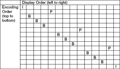 僅僅使用前一個(gè)顯示的基準(zhǔn)幀來(lái)編碼的幀被稱為“P幀”,同時(shí)使用前一個(gè)顯示幀和未來(lái)幀作為基準(zhǔn)幀進(jìn)行編碼的幀稱為“B幀”。在通常的場(chǎng)景中,編解碼器編碼一個(gè)I幀,然后向前跳過(guò)幾個(gè)幀,用編碼I幀作為基準(zhǔn)幀對(duì)一個(gè)未來(lái)P幀進(jìn)行編碼,然后跳回到I幀之后的下一個(gè)幀。編碼的I幀和P幀之間的幀被編碼為B幀。之后,編碼器會(huì)再次跳過(guò)幾個(gè)幀,使用第一個(gè)P幀作為基準(zhǔn)幀編碼另外一個(gè)P幀,然后再次跳回,用B幀填充顯示序列中的空隙。這個(gè)過(guò)程不斷繼續(xù),每12到15個(gè)P幀和B幀內(nèi)插入一個(gè)新的I幀。例如,圖1種給出了一個(gè)典型的視頻幀序列。