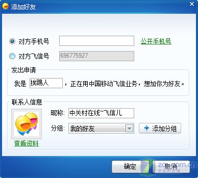 第一次登錄使用飛信的朋友可以通過兩個方式獲取好友,一個是將自己的號告知好友,讓他們將你加為好友,另一個是自己查找并添加其他好友(如圖2)。
