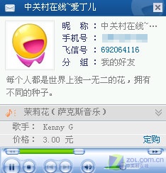 你可以點擊藍色文字鏈接,在彈出的窗口中單擊左下角的“播放/暫!卑粹o,以實現(xiàn)在PC機上聽好友彩鈴(如圖5)!這樣的功能其它IM軟件好像沒有,唯飛信才有的獨家功能!