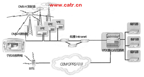 DVB-H系統(tǒng)依托DVB-T傳輸系統(tǒng),通過增加一定的附加功能和改進技術使手持終端能夠穩(wěn)定地接收廣播電視信號。DVB-H可以保證移動終端在移動環(huán)境和微功耗條件下接收數字電視節(jié)目,從而很好地配合3G網絡的應用。3G網絡除完成它自身的功能外,還充當DVB-H網絡的反向控制信道,傳輸諸如視頻點播、電視投票、電視瀏覽、交互式游戲等業(yè)務信令,提供多種個性化的多媒體業(yè)務,從而實現(xiàn)兩種網絡的融合。