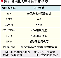 3GPP采用和其他標(biāo)準(zhǔn)化組織密切合作的方式制訂IMS技術(shù)標(biāo)準(zhǔn),并依靠各國(guó)通信界的協(xié)同不斷發(fā)展和完善(如表1所示)。其中,最重要的合作就是和IETF聯(lián)合開發(fā)了IMS網(wǎng)絡(luò)的核心控制協(xié)議SIP[1],共同研究SIP的擴(kuò)展和應(yīng)用。另一個(gè)重要的合作是和Parlay組織聯(lián)合開發(fā)了支持開放式業(yè)務(wù)提供的Parlay/開放業(yè)務(wù)接入(OSA)應(yīng)用程序接口(API),將源于固定智能網(wǎng)結(jié)構(gòu)開放的Parlay技術(shù)引入IMS網(wǎng)絡(luò)的OSA結(jié)構(gòu)[2]。最重要的協(xié)同就是ETSI的TISPAN研究組和ITU-T提出了IMS中融入固定接入的技術(shù)[3],另一個(gè)重要的協(xié)同是OMA組織提出了許多基于IMS實(shí)現(xiàn)的業(yè)務(wù)規(guī)范和技術(shù)[4]。