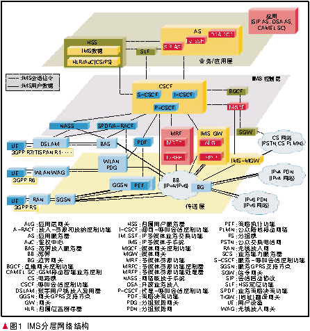 首先,IMS鑒于VoIP的成功應(yīng)用,在承載層摒棄了長(zhǎng)期以來(lái)在傳統(tǒng)電信網(wǎng)中占主導(dǎo)地位的電路交換(CS)域,采用基于IP技術(shù)的單一的PS域傳輸各種媒體和信令數(shù)據(jù)流,即首次提出在通信網(wǎng)中采用全I(xiàn)P承載網(wǎng)絡(luò),使之成為通信網(wǎng)融合的底層基礎(chǔ)。