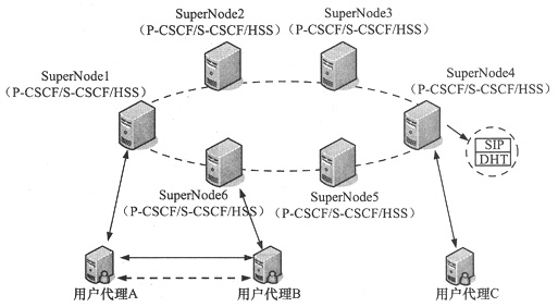 IMS網(wǎng)絡(luò)中的功能實(shí)體基本一致,但二者可以和基于DHT的HSS功能集成在一個(gè)物理實(shí)體,使得網(wǎng)絡(luò)控制層的功能能夠均質(zhì)化,同時(shí),由于分布式IMS系統(tǒng)中的用戶簽約信息存儲在基于DHT的HSS中,可以使用DHT算法快速定位用戶所在的SuperNode,進(jìn)而可以優(yōu)化網(wǎng)絡(luò)的路由。