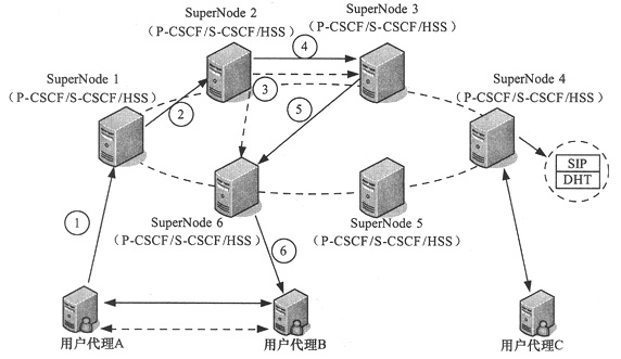 。4)根據(jù)(3)中HSS返回的信息,把會話請求路由到用戶B所歸屬的SuperNode3。