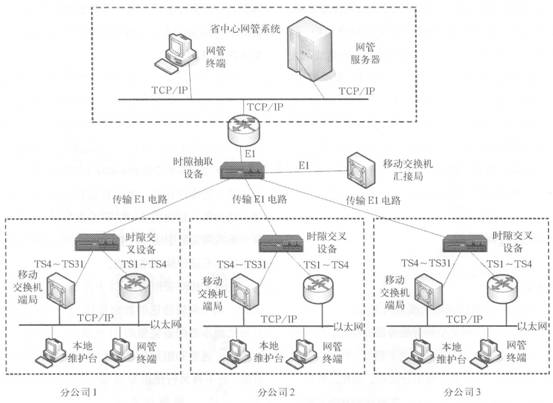 同樣以移動(dòng)網(wǎng)為例,例子中移動(dòng)交換機(jī)到維護(hù)終端支持TCP/IP方式,分公司具有本地維護(hù)終端和網(wǎng)管終端兩種類(lèi)型的維護(hù)臺(tái)。本地維護(hù)終端通過(guò)以太交換機(jī)直接與移動(dòng)交換機(jī)相連;網(wǎng)元和網(wǎng)管終端通過(guò)以太網(wǎng)接入邊緣路由器,經(jīng)路由器接.el轉(zhuǎn)化以El方式接入到時(shí)隙抽取設(shè)備中,由于傳送網(wǎng)管信息占用帶寬較小,