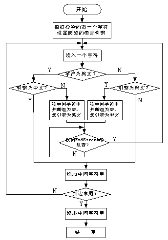 Sam,這樣就實(shí)現(xiàn)了中英文混合文本的朗讀。具體的解決方案是:依序處理文本中每個(gè)字符,判斷字符中含有的中英文類型,若類型與前一字符相同則添加至中間變量,否則朗讀中間變量文本并保存當(dāng)前位置,接著切換引擎。文本朗讀結(jié)束,發(fā)出EndStream消息,從當(dāng)前位置繼續(xù)循環(huán)。其流程圖如圖4所示。