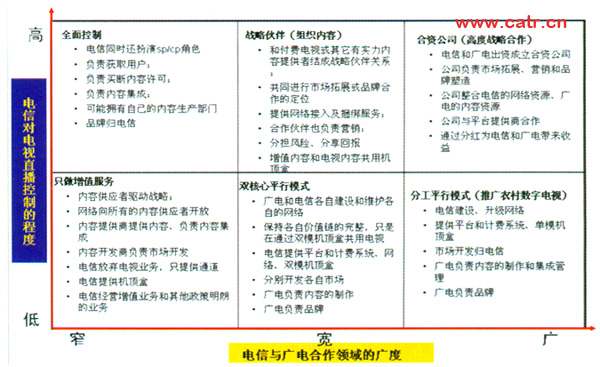 評(píng)點(diǎn):低合作度配合模式對(duì)固網(wǎng)公司而言的優(yōu)點(diǎn)是:容易實(shí)行,不存在政策風(fēng)險(xiǎn)。缺點(diǎn)是沒有直播內(nèi)容;價(jià)值鏈中的地位太低;內(nèi)容資源缺乏,對(duì)用戶吸引力不足;收入太低;成本與收益不成比例。