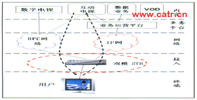 這種模式的合作點(diǎn)主要在接入層面,以提供雙模機(jī)頂盒為主要方法。固網(wǎng)公司和廣電發(fā)揮各自資源優(yōu)勢(shì)進(jìn)行合作。廣電節(jié)目傳送由廣電負(fù)責(zé),同網(wǎng)提供寬帶增值服務(wù),兩者分業(yè)經(jīng)營,地位平等。