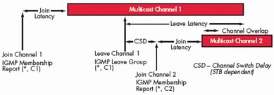 TV節(jié)目通常采用組播方式進(jìn)行傳送。組播是一種允許一個或多個發(fā)送者(組播源)一次同時發(fā)送單一的數(shù)據(jù)包到多個接收者的網(wǎng)絡(luò)技術(shù)。組播源把數(shù)據(jù)包發(fā)送到特定組播組,而只有屬于該組播組的地址才能接收到數(shù)據(jù)包。在IPTV里,組播源往往僅有一個,即使用戶數(shù)量成倍增長,主干帶寬也不需隨之增加,因?yàn)闊o論有多少個目標(biāo)地址,在整個網(wǎng)絡(luò)的任何一條主干鏈路上只傳送單一視頻流,即所謂“一次發(fā)送,組內(nèi)廣播”。組播提高了數(shù)據(jù)傳送效率,減少了主干網(wǎng)出現(xiàn)擁塞的可能性。對于TV系統(tǒng)而言,其所能夠支持的用戶數(shù)目僅僅受到接入網(wǎng)絡(luò)能力的限制,與前端推送系統(tǒng)的推送能力無關(guān)。因此,TV業(yè)務(wù)性能的主要測試指標(biāo)包括所推送的最大頻道數(shù)目、頻道平均帶寬、平均頻道切換時間、I幀加入延時、平均頻道離開延時、平均頻道加入延時、頻道重疊時間和頻道間隔時間。