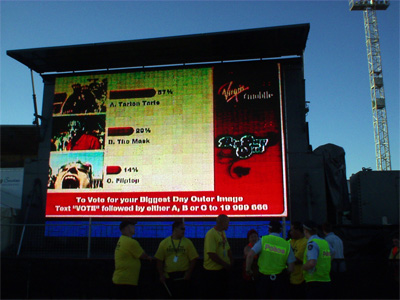 比如,某些公司可能會使用上面所述的調節(jié)型文本信息收發(fā)方式來顯示滾動的帶狀區(qū)內容,但也會在文本顯示的過程中覆蓋某張由手機用戶拍攝的圖象。這張圖片一般可能是該用戶的貓或狗,然后加上一些有趣的元素。在戶外活動中,我們可以用拍到的圖象來加強文本信息。比如,活動現(xiàn)場可以就屏幕上的一張照片提問“他夠不夠火辣?”。這樣的問答結果隨后就可以被實時廣播到屏幕上。