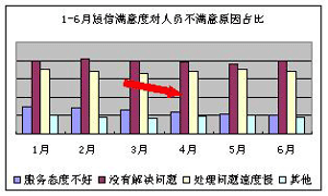 客服代表的工作情緒及客戶滿意度呈現(xiàn)上升趨勢:3-6月的短信滿意度穩(wěn)步提升(見下圖1),6月短信滿意度較3月提升1.25個(gè)百分點(diǎn),短信滿意度調(diào)查中“非常滿意”項(xiàng)占比自4月份開上升1.42個(gè)百分點(diǎn)(見下圖2)。從客戶不滿意原因情況看,由于人員導(dǎo)致客戶不滿意的比例下降0.6%(見下圖3);對(duì)導(dǎo)致人員不滿意的原因分析可知,話務(wù)員服務(wù)態(tài)度不好的占比有明顯的下降(見下圖4)。