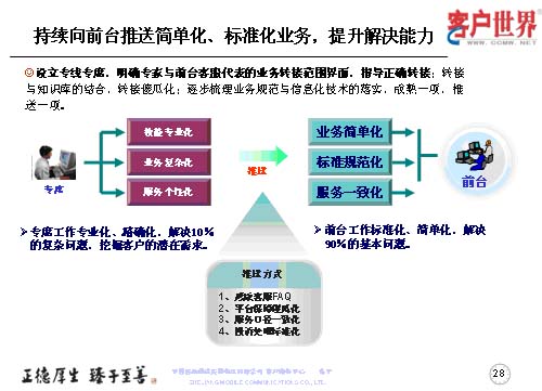三個(gè)階段可以分為集中初始的02年10月到04年,規(guī)模運(yùn)營是04年底到07年的4月,那么07年4月至今已經(jīng)是專線專席運(yùn)營。我們的重點(diǎn)是在規(guī)模運(yùn)營和專線專席上有所突破,規(guī)模運(yùn)營主要是結(jié)合品牌策略,率先推出的是品牌客戶分層服務(wù);雙中心網(wǎng)絡(luò)呼叫中心解決方案應(yīng)用,實(shí)現(xiàn)互聯(lián)網(wǎng)思維模式及邏輯管理集中,物理結(jié)構(gòu)分散的多中心網(wǎng)絡(luò)呼叫中心;追求客戶滿意,運(yùn)營效率和效益的統(tǒng)一。07年開始,我們重點(diǎn)實(shí)現(xiàn)客服系統(tǒng)與業(yè)務(wù)BOSS系統(tǒng)的全面融合,實(shí)現(xiàn)客戶服務(wù)應(yīng)用的統(tǒng)一門戶。也就是說,無論是我們的電話服務(wù)、營業(yè)廳的服務(wù),還是客戶經(jīng)理的上門服務(wù),都應(yīng)用于客戶服務(wù)的統(tǒng)一門戶,實(shí)現(xiàn)著CRM的客戶關(guān)系管理。對(duì)于電話服務(wù)來講,我們以標(biāo)準(zhǔn)化、專業(yè)化的熱線服務(wù)運(yùn)營模式,提升專家級(jí)的精細(xì)化服務(wù)和大眾客戶的標(biāo)準(zhǔn)化服務(wù),使得管理和培訓(xùn)更聚焦,客戶代表更為輕松,同時(shí)也提高了員工滿意度,實(shí)現(xiàn)了追求客戶愉悅體驗(yàn)、員工滿意和為企業(yè)創(chuàng)造價(jià)值。