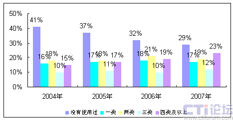 圖1 2004-2007年用戶(hù)使用智能手機(jī)使用的移動(dòng)互聯(lián)網(wǎng)種類(lèi)
