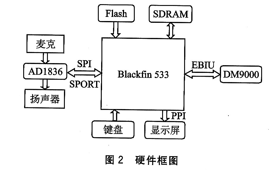 Blackfin 533為核心處理器芯片。外圍輔以ADl836實現(xiàn)語音信號的采集和播放;DM9000實現(xiàn)網(wǎng)絡(luò)數(shù)據(jù)包的收發(fā);TFT