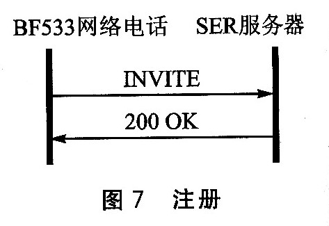 注冊過程如圖7所示。BF533網(wǎng)絡(luò)電話和SER服務(wù)器共交換了兩條消息:一條是目標系統(tǒng)向服務(wù)器發(fā)送的REGISTER請求消息,另一條是服務(wù)器發(fā)送的200