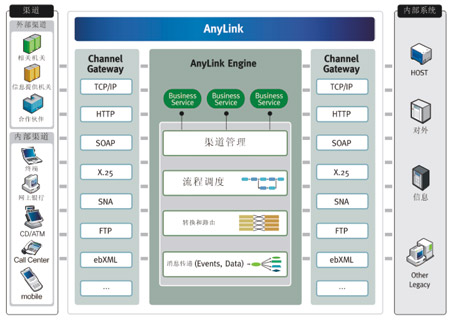 通過基于AnyLink的電子渠道統(tǒng)一接口平臺解決方案提供各類網(wǎng)關功能,可實現(xiàn)各種系統(tǒng)的整合,還提供報文轉換及路由的中介功能、管理和監(jiān)控所需的GUI工具,實現(xiàn)系統(tǒng)運營和維護及開發(fā)的最佳化(如圖所示)。